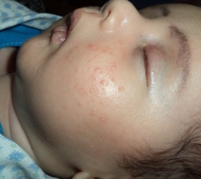 بخار های که در اکنه نوزادی بوجود مییاید مشبابه جوانی دانه بوده که شامل دانه های سرسیاه؛ دانه های سرسفید؛ پپولها یا دانه های سرخرنگ برجسته از سطح جلدو دانه پر چرک یا پستول میباشد خوشبختانه این دانه اکثرآ بدون ندبه یا داغ بهبود مییابند این دانه ها بیشتر در گونه ها یا رخسار،